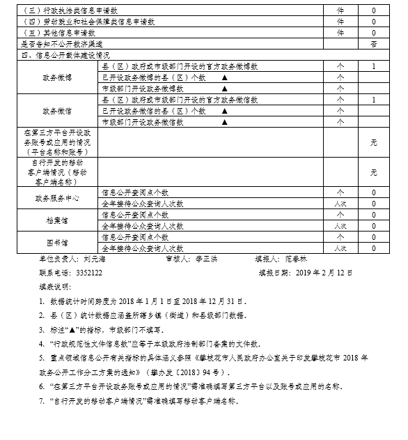 本年度报告是根据《中华人民共和国政府信息公开条例》(以下简称《条例》)和《四川省人民政府办公厅关于加强和规范政府信息公开情况统计报送工作的通知》要求,汇总攀枝花市财政局门户网站、四川省政府采购网(攀枝花市部分)、攀枝花市公共信息网政府信息公开(市财政局部门)数据编制而成。本报告由概述、财政预决算信息公开情况、财政专项资金信息公开情况、政府采购信息公开情况、财政政策信息宣传情况、存在的主要问题和改进措施等六个部分组成。本报告中所列数据的统计时间为2018年1月1日至2018年12月31日。如对本报告有任何疑问,请与攀枝花市财政局办公室联系(联系电话:0812-3352122)。
